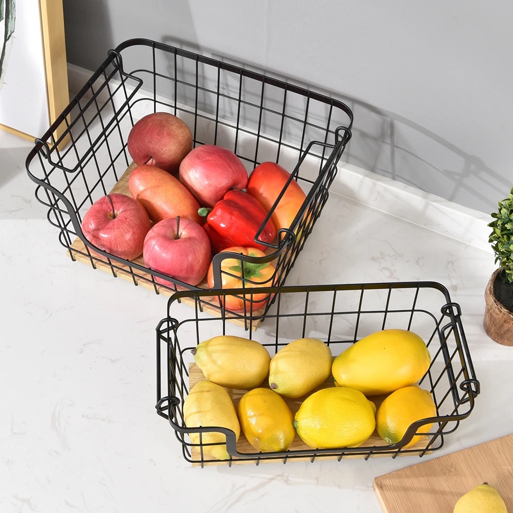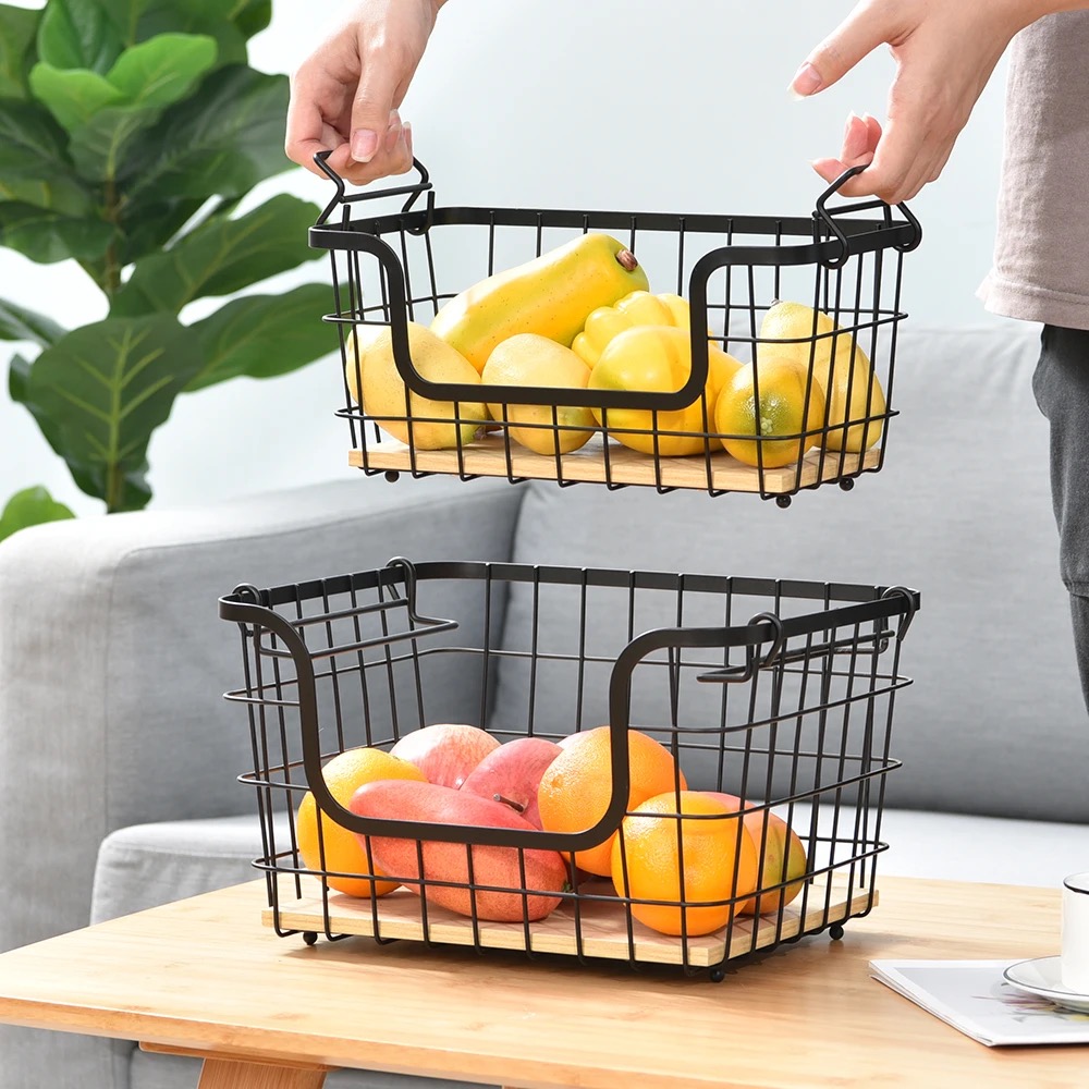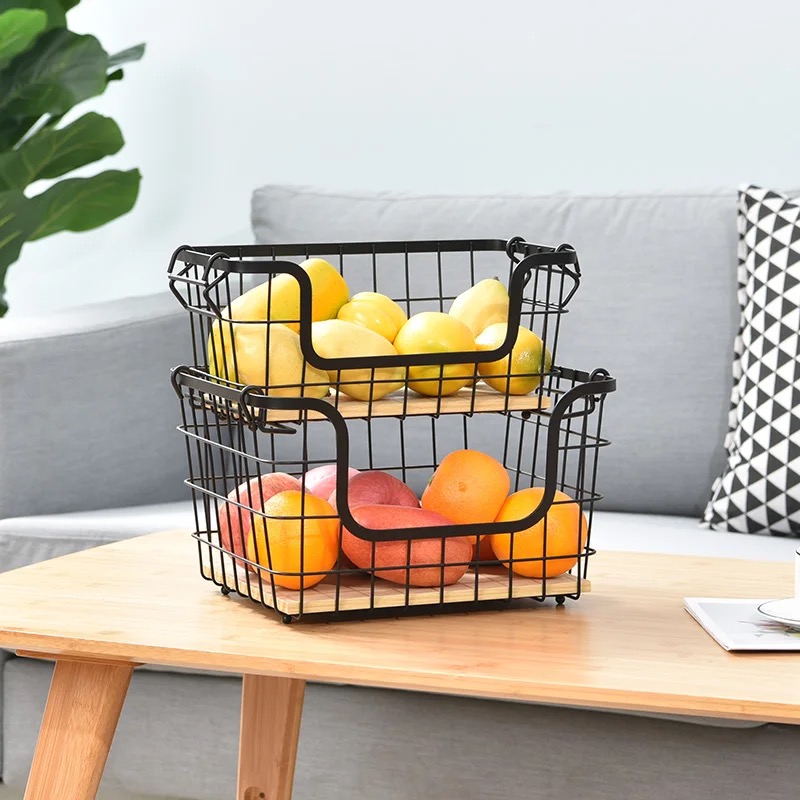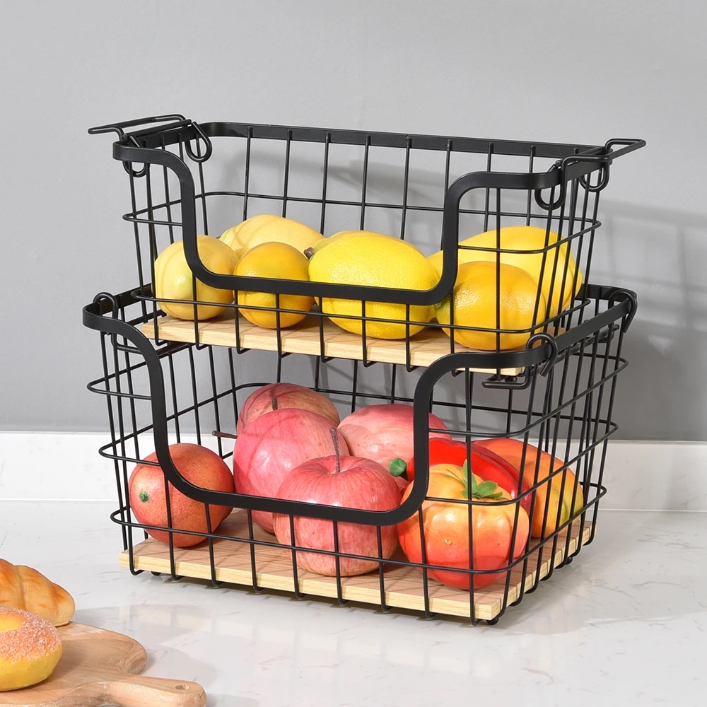 CANASTO DE METAL RECTANG. 2 PISOS CON MANIJA DE MADERA