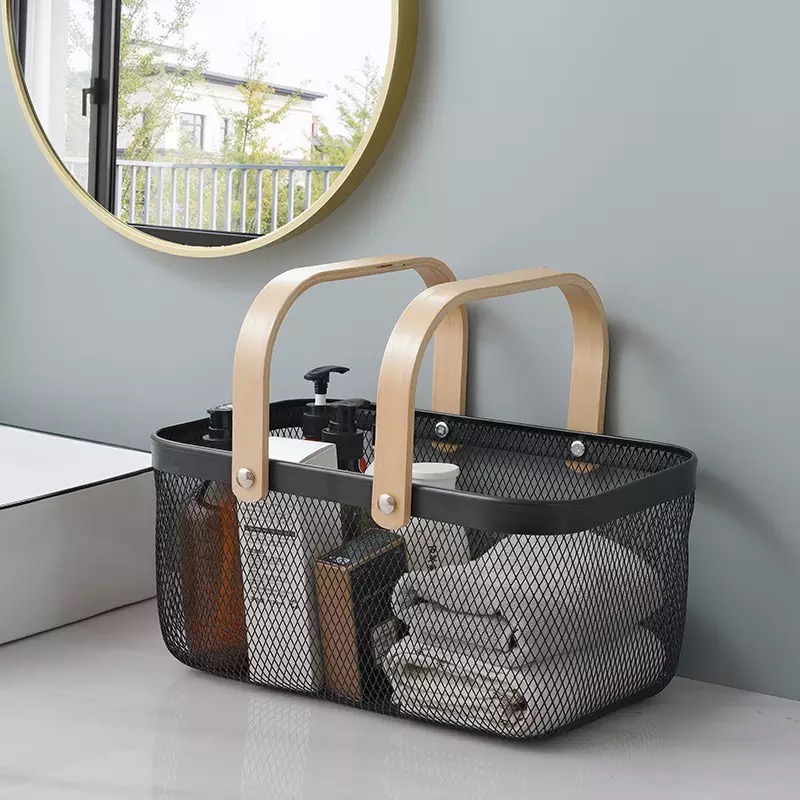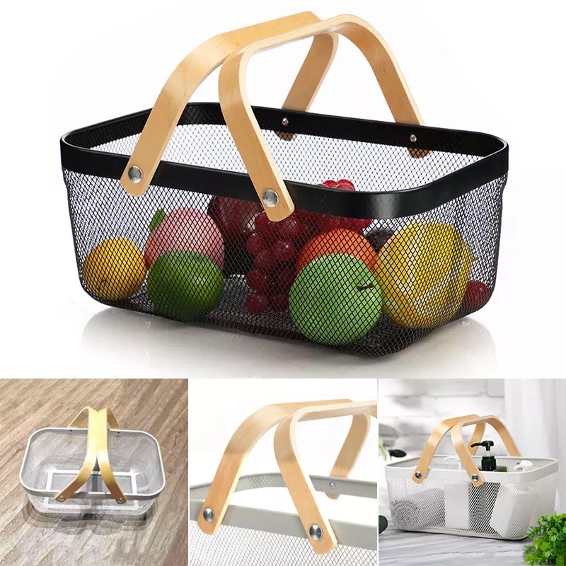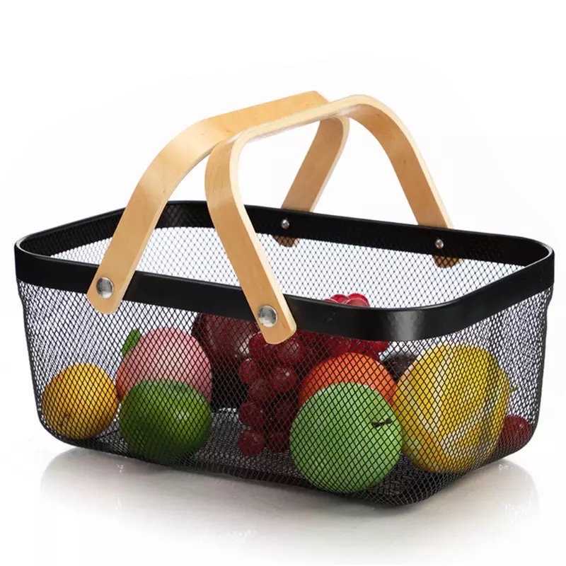 CANASTO DE METAL CON MANIJA DE MADERA