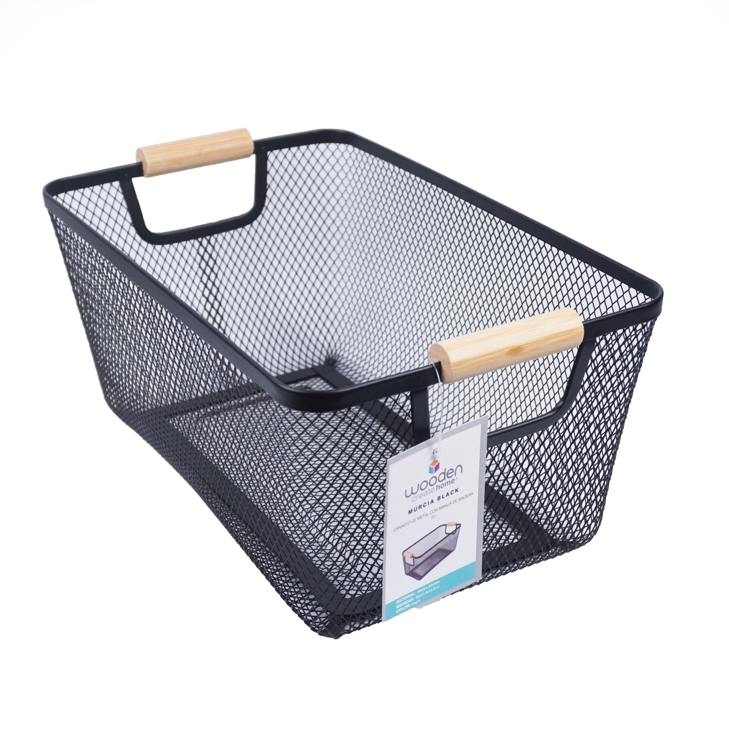 CANASTO DE METAL CON MANIJA DE MADERA
